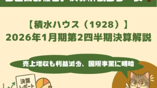 積水ハウス〈1928〉の2026年1月期2Q決算速報。売上は増収も利益減少。国際事業の課題や都市開発の反動、配当維持の安心感と下期への期待をジピ太が解説🐾