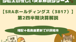 SRAホールディングス(3817)の2026年3月期第2四半期決算をジピ太がわかりやすく解説。売上・利益は過去最高、年間配当は190円へ増配。事業別動向や投資基準診断も紹介しています。